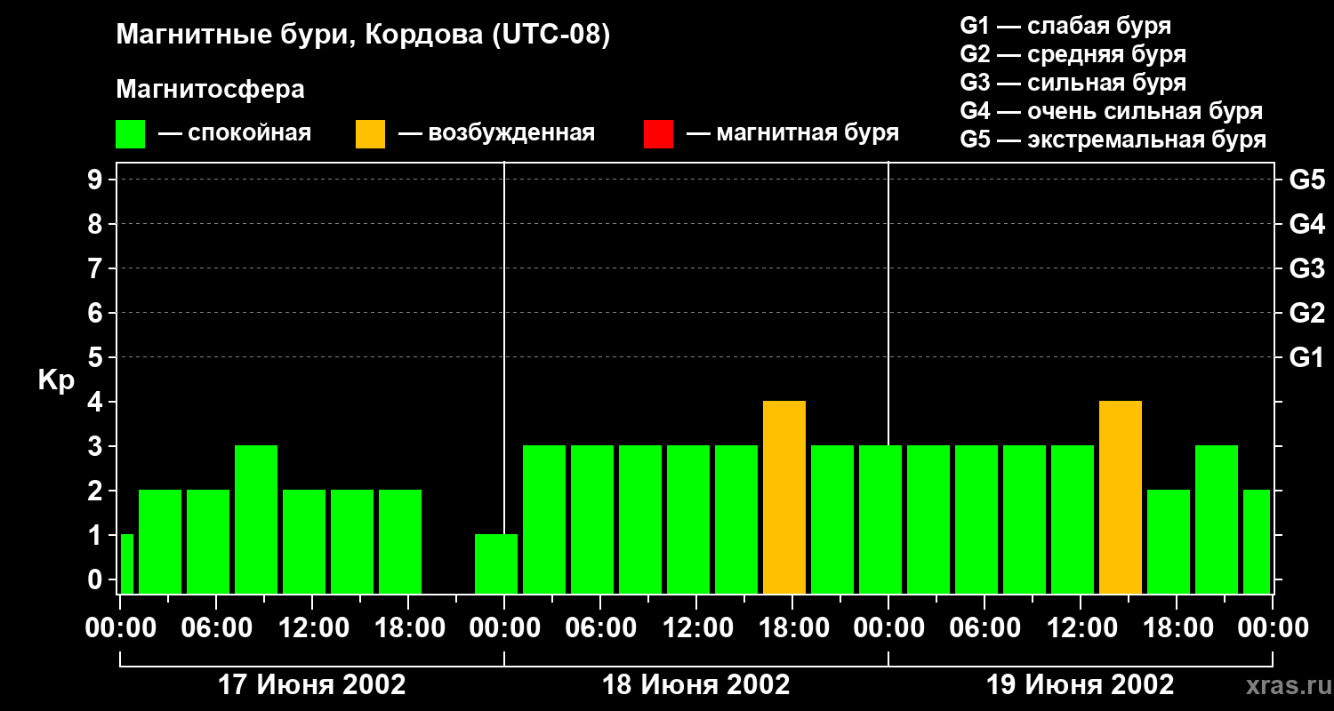 Изменения геомагнитного индекса Kp с 17 по 19 июня 2002 года для средних широт