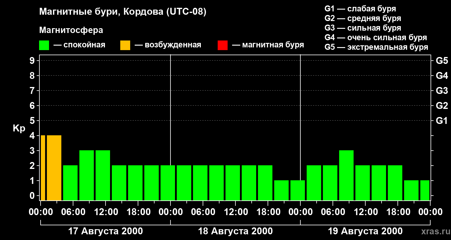 Изменения геомагнитного индекса Kp с 17 по 19 августа 2000 года для средних широт