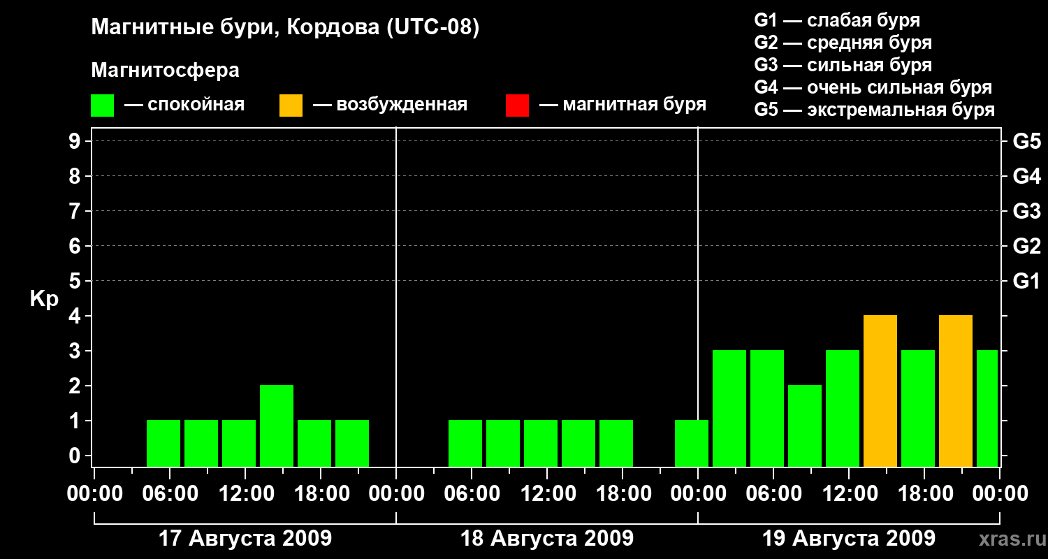 Изменения геомагнитного индекса Kp с 17 по 19 августа 2009 года для средних широт