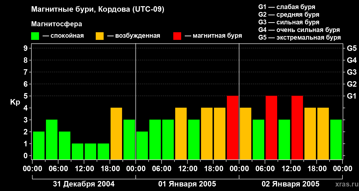 Изменения геомагнитного индекса Kp с 31 декабря 2004 года по 2 января 2005 года для средних широт
