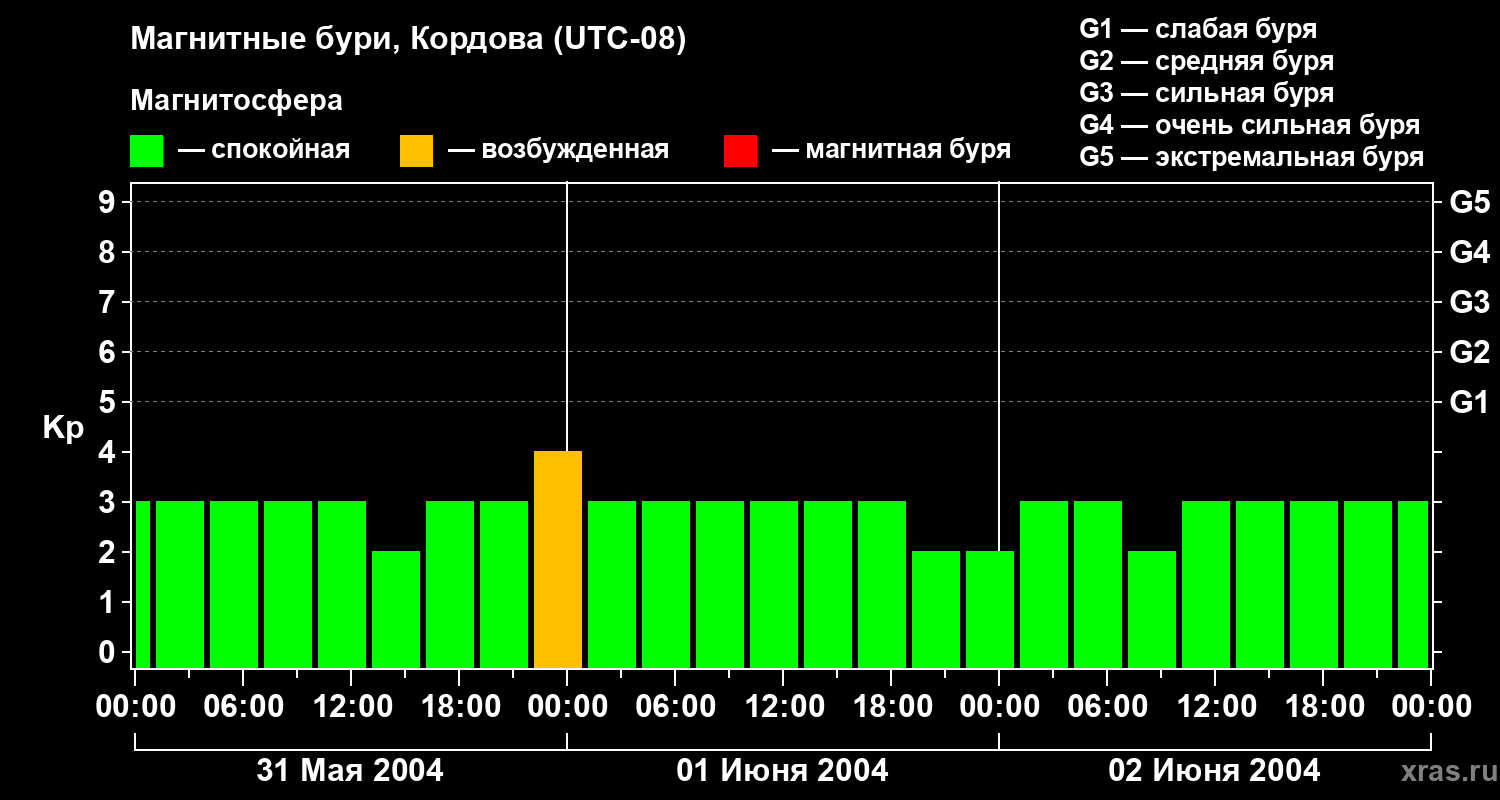 Изменения геомагнитного индекса Kp с 31 мая по 2 июня 2004 года для средних широт