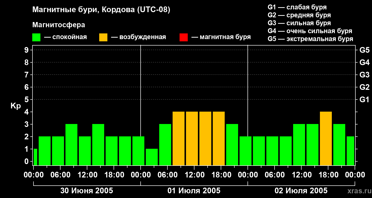 Изменения геомагнитного индекса Kp с 30 июня по 2 июля 2005 года для средних широт