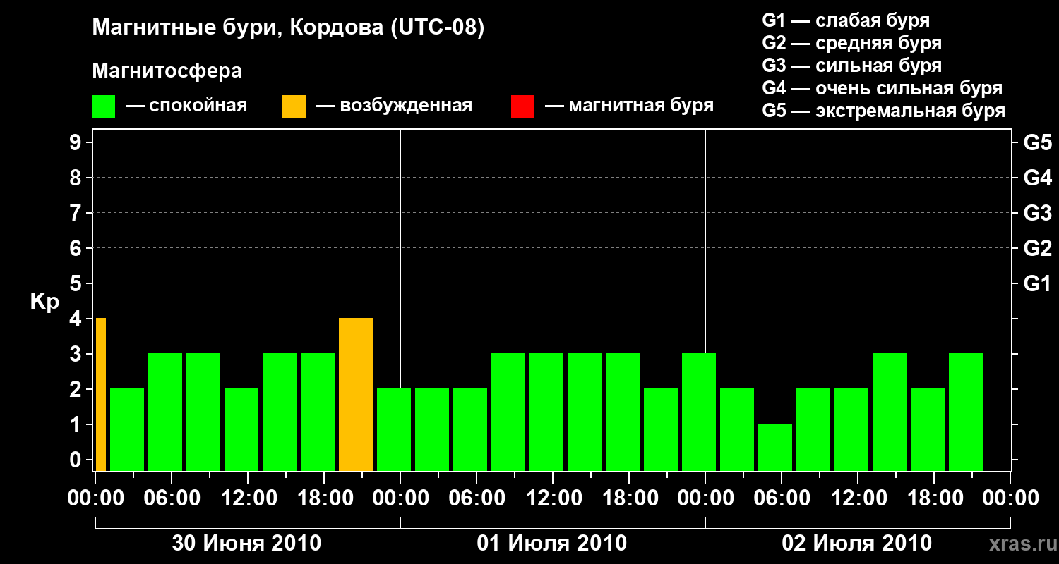 Изменения геомагнитного индекса Kp с 30 июня по 2 июля 2010 года для средних широт