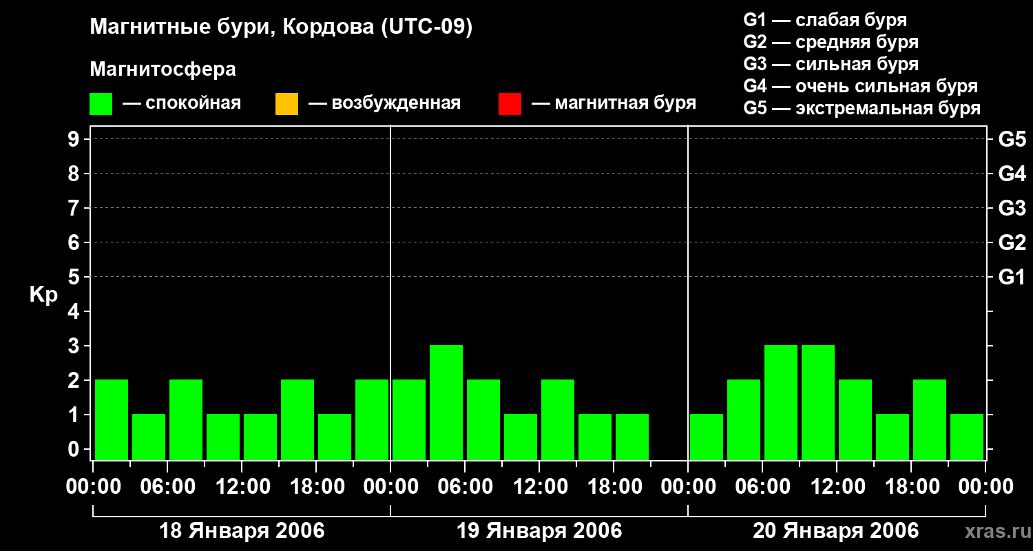 Изменения геомагнитного индекса Kp с 18 по 20 января 2006 года для средних широт