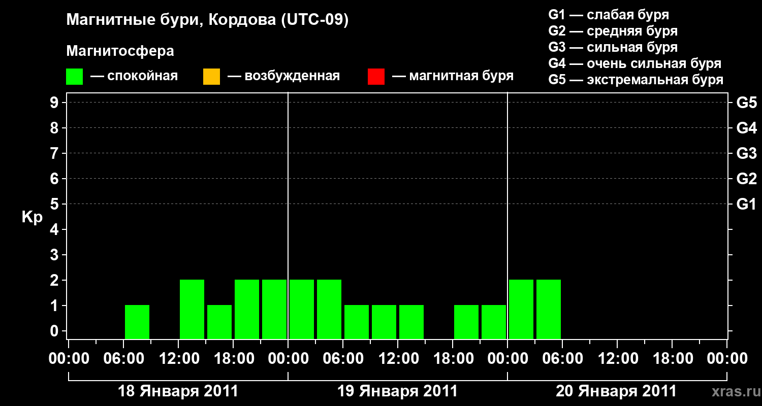 Изменения геомагнитного индекса Kp с 18 по 20 января 2011 года для средних широт