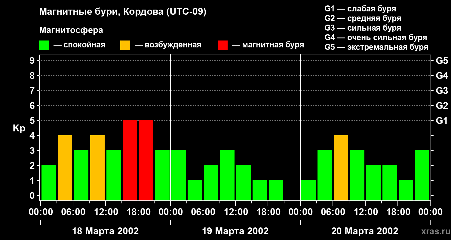 Изменения геомагнитного индекса Kp с 18 по 20 марта 2002 года для средних широт