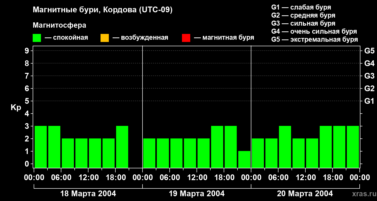 Изменения геомагнитного индекса Kp с 18 по 20 марта 2004 года для средних широт