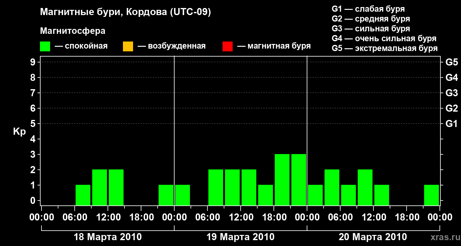 Изменения геомагнитного индекса Kp с 18 по 20 марта 2010 года для средних широт