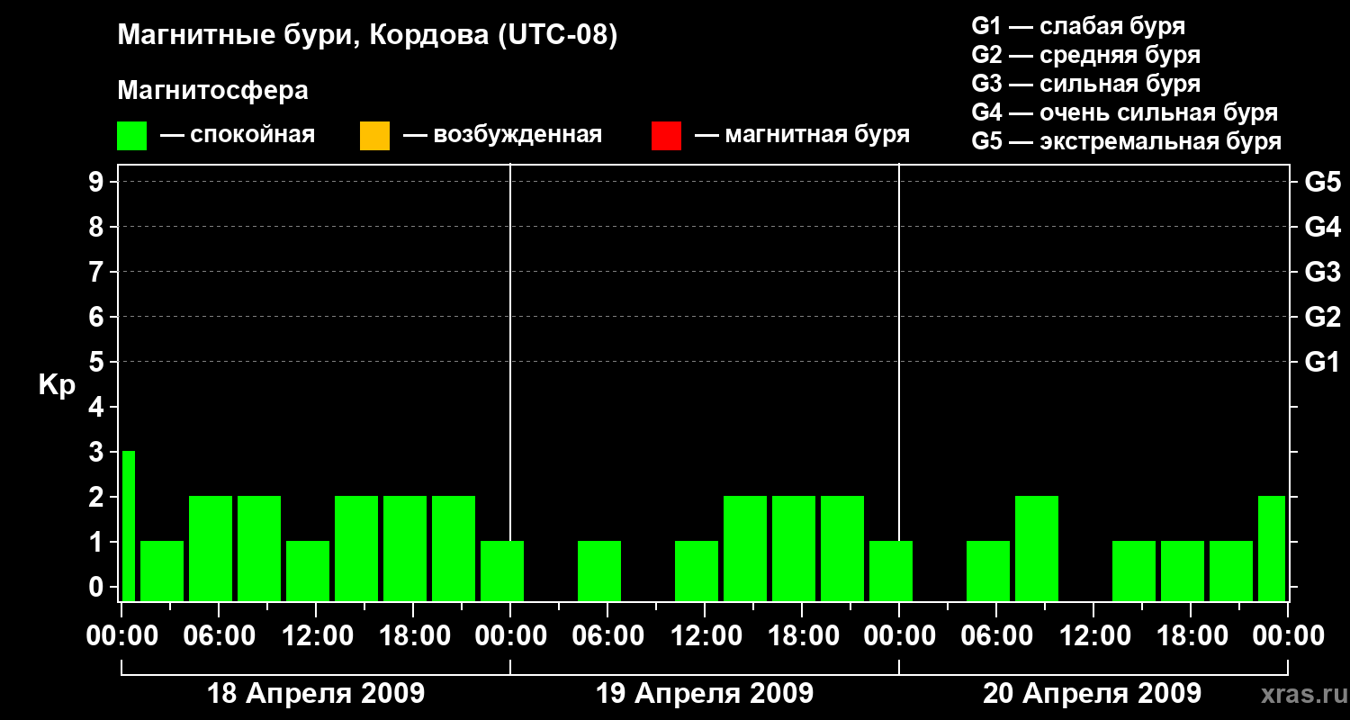 Изменения геомагнитного индекса Kp с 18 по 20 апреля 2009 года для средних широт