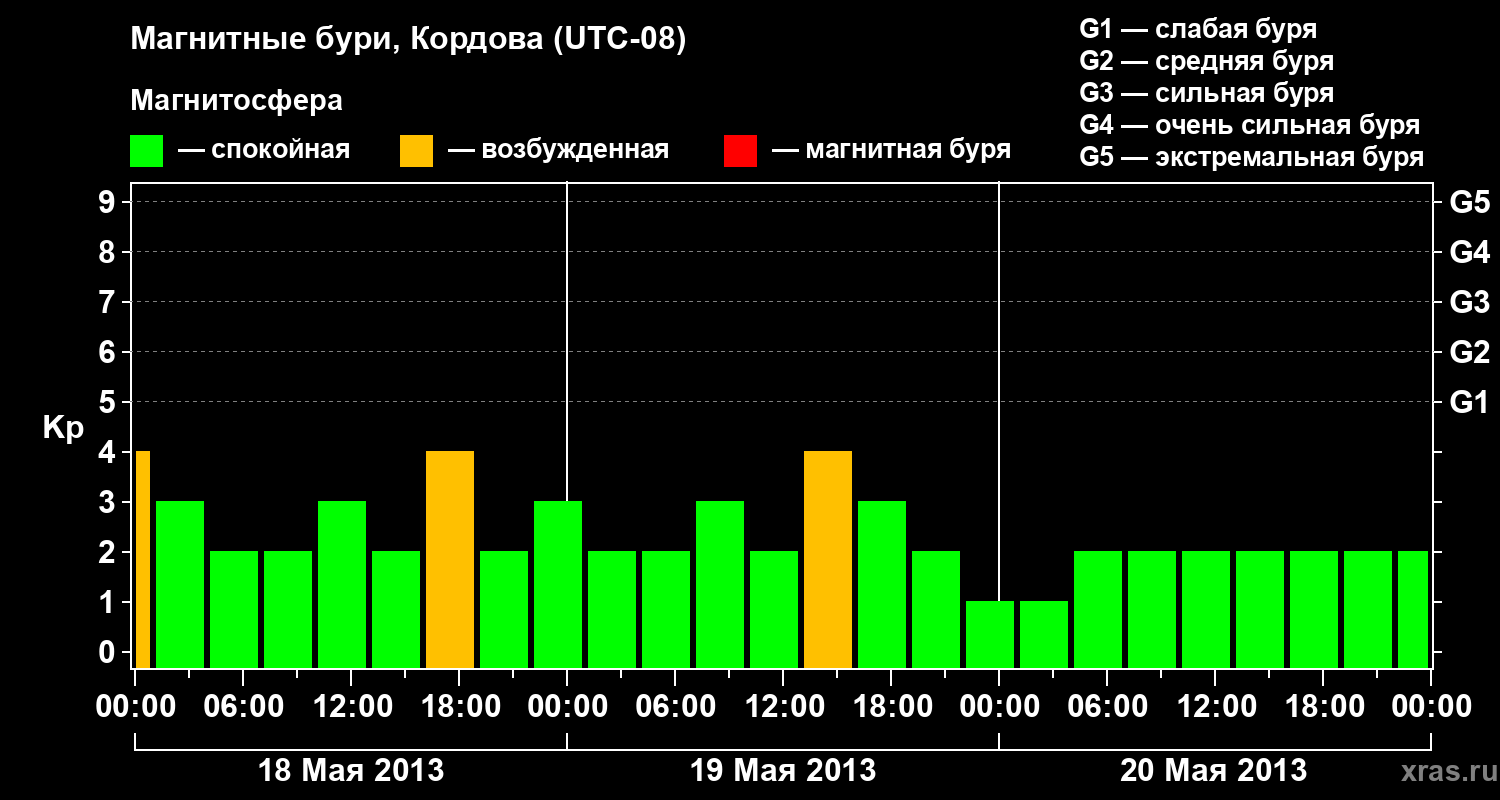 Изменения геомагнитного индекса Kp с 18 по 20 мая 2013 года для средних широт