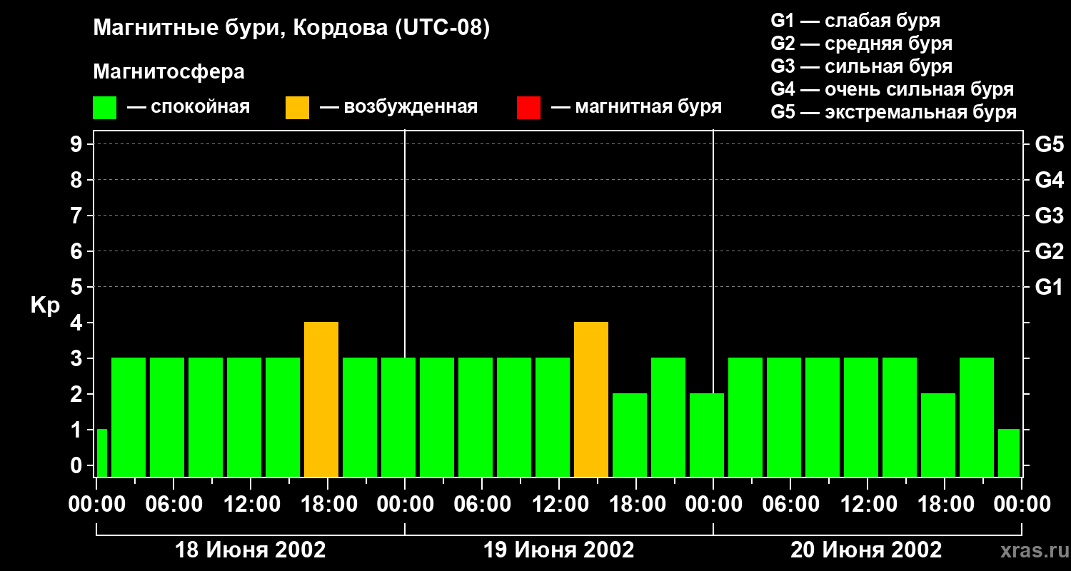 Изменения геомагнитного индекса Kp с 18 по 20 июня 2002 года для средних широт