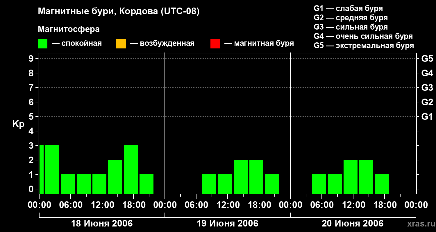 Изменения геомагнитного индекса Kp с 18 по 20 июня 2006 года для средних широт