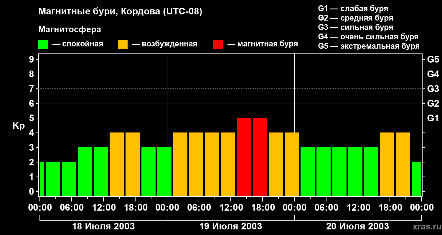 Изменения геомагнитного индекса Kp с 18 по 20 июля 2003 года для средних широт
