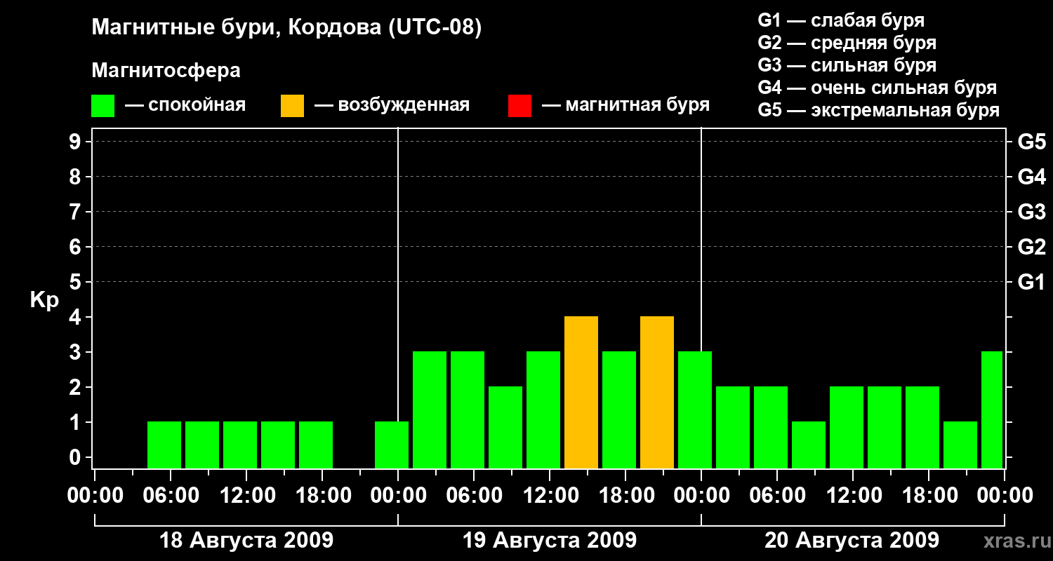 Изменения геомагнитного индекса Kp с 18 по 20 августа 2009 года для средних широт