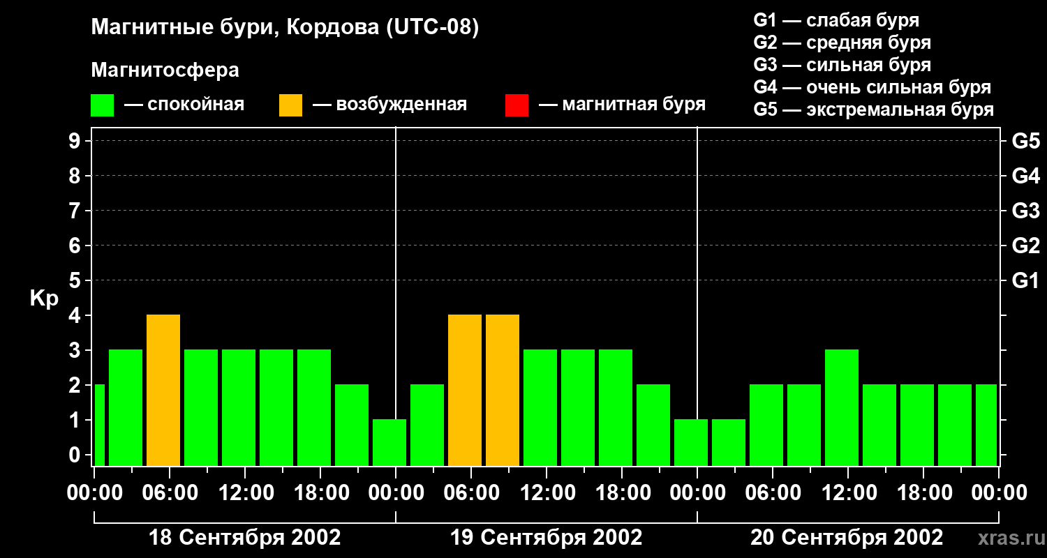 Изменения геомагнитного индекса Kp с 18 по 20 сентября 2002 года для средних широт