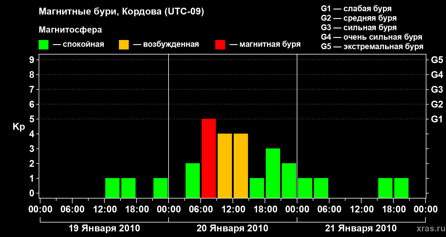 Изменения геомагнитного индекса Kp с 19 по 21 января 2010 года для средних широт