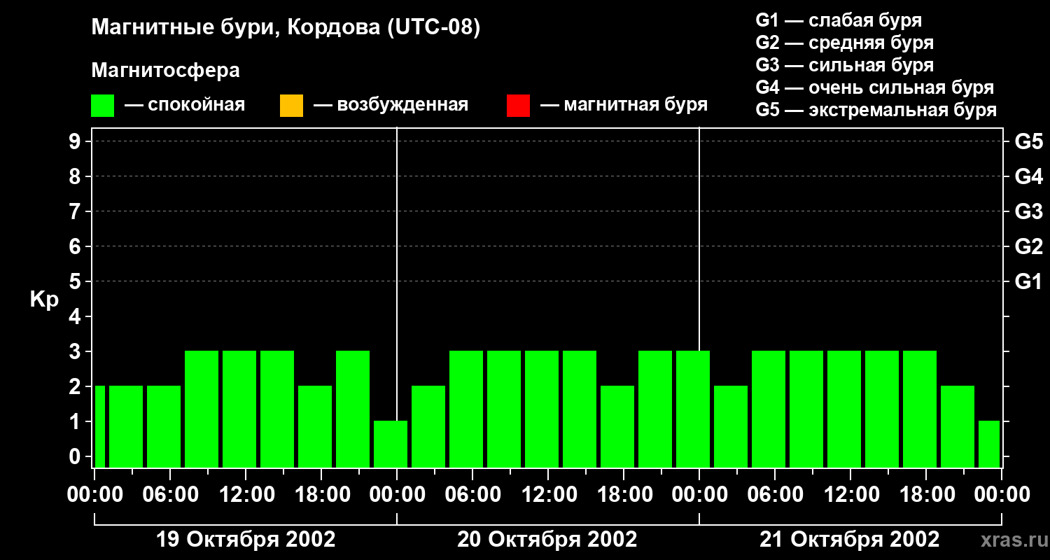 Изменения геомагнитного индекса Kp с 19 по 21 октября 2002 года для средних широт