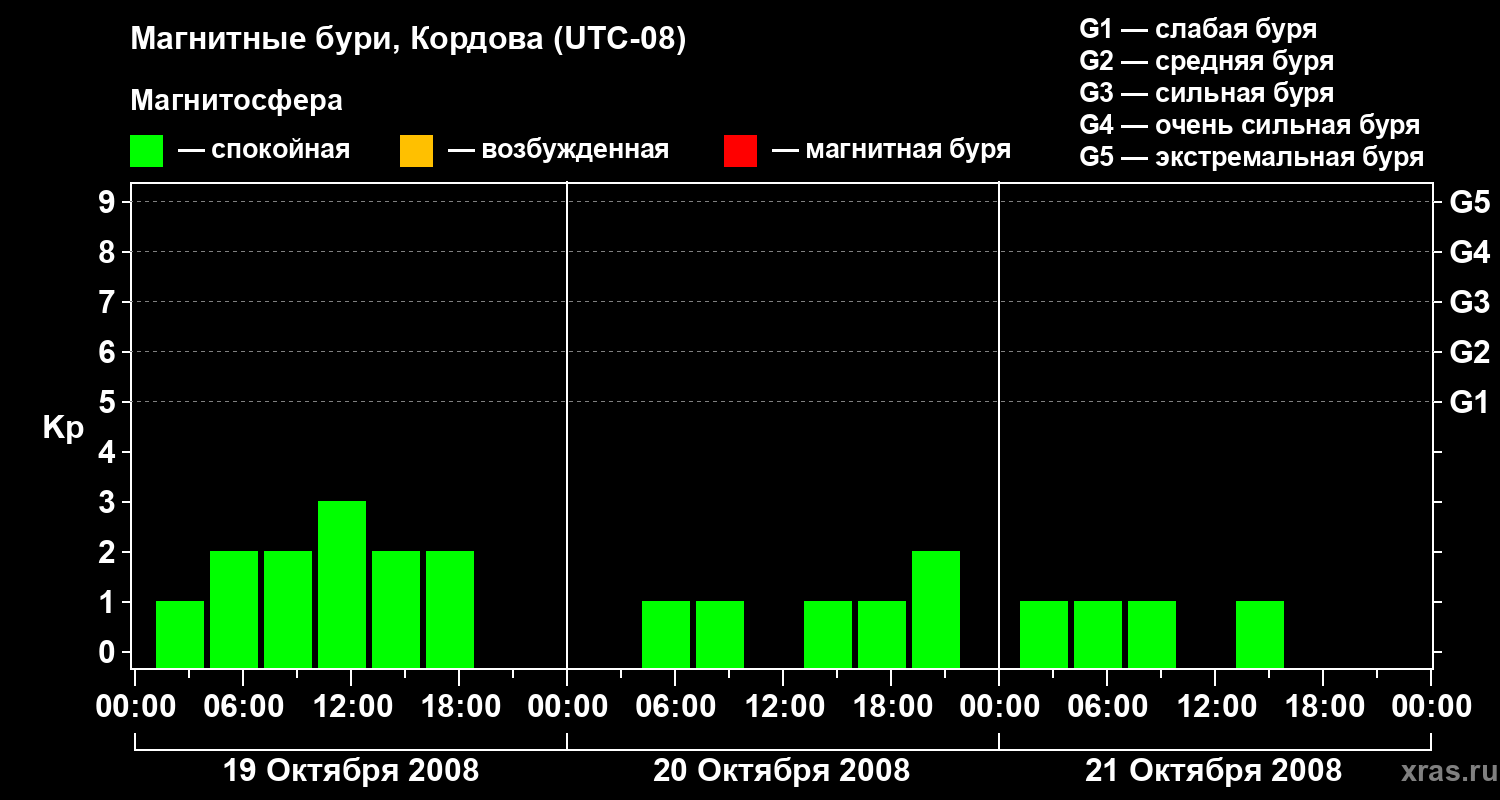 Изменения геомагнитного индекса Kp с 19 по 21 октября 2008 года для средних широт