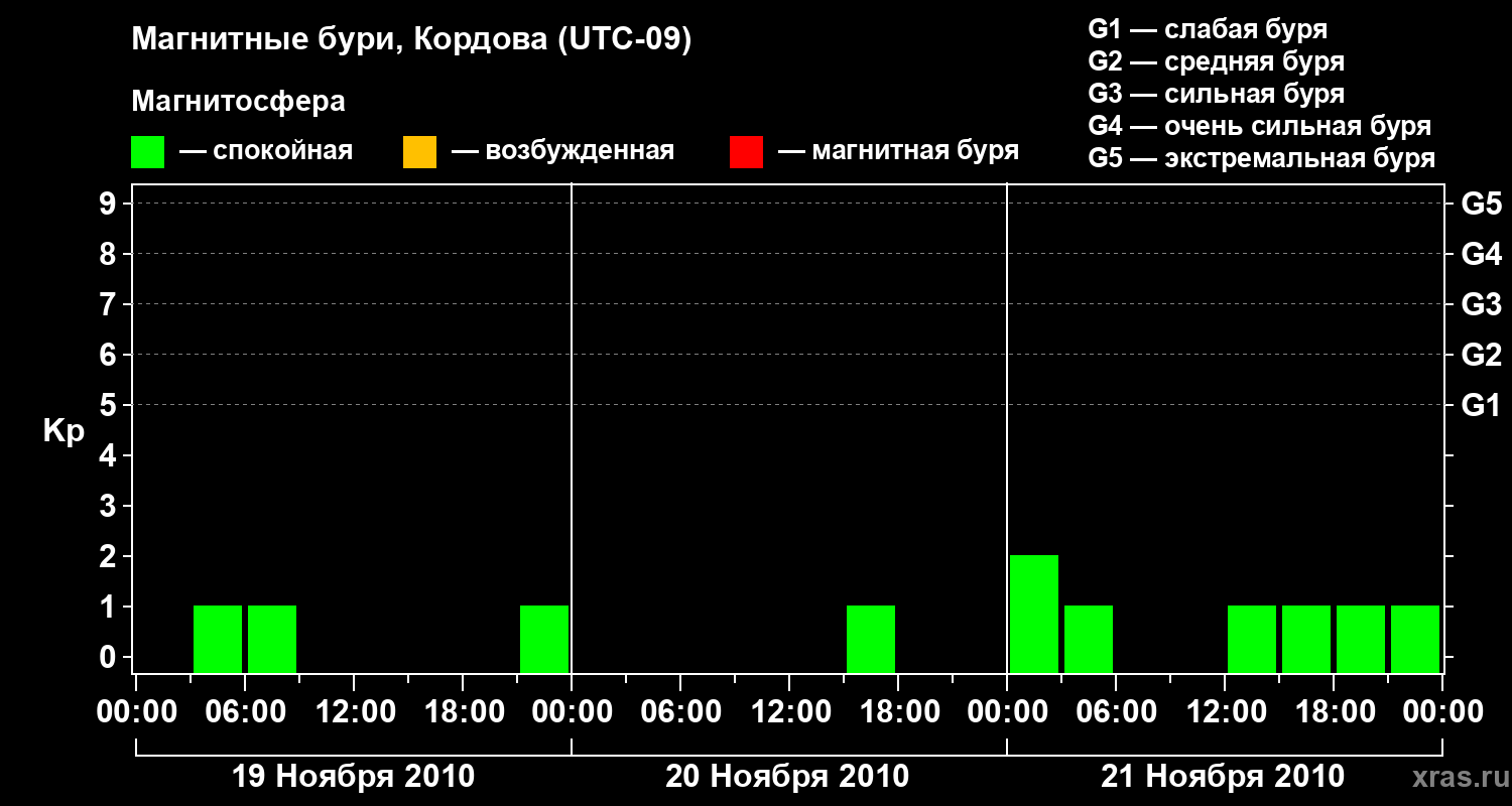 Изменения геомагнитного индекса Kp с 19 по 21 ноября 2010 года для средних широт