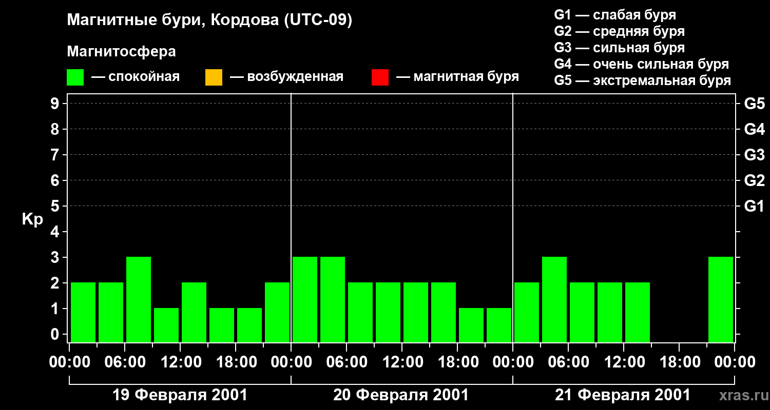 Изменения геомагнитного индекса Kp с 19 по 21 февраля 2001 года для средних широт