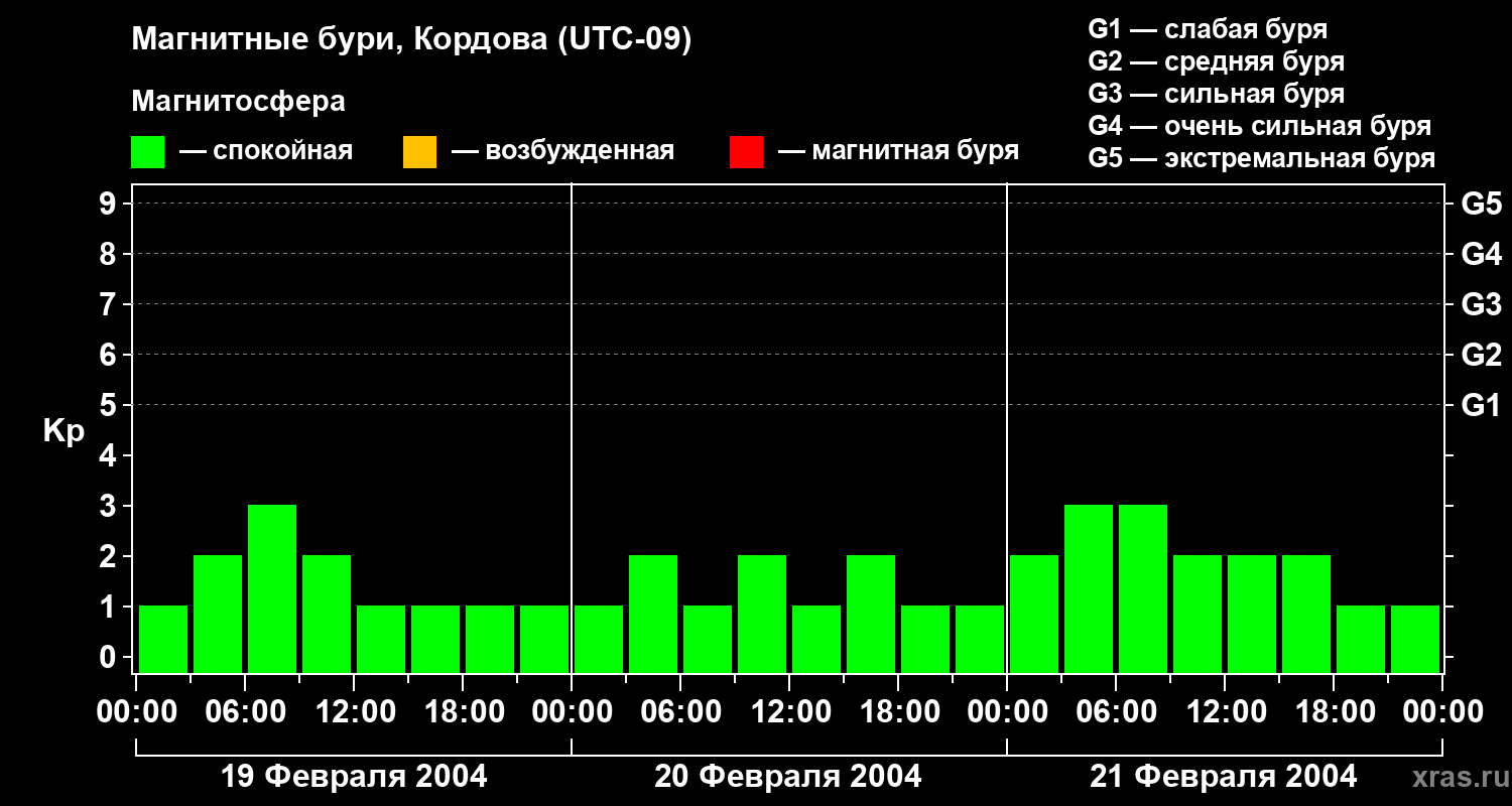 Изменения геомагнитного индекса Kp с 19 по 21 февраля 2004 года для средних широт