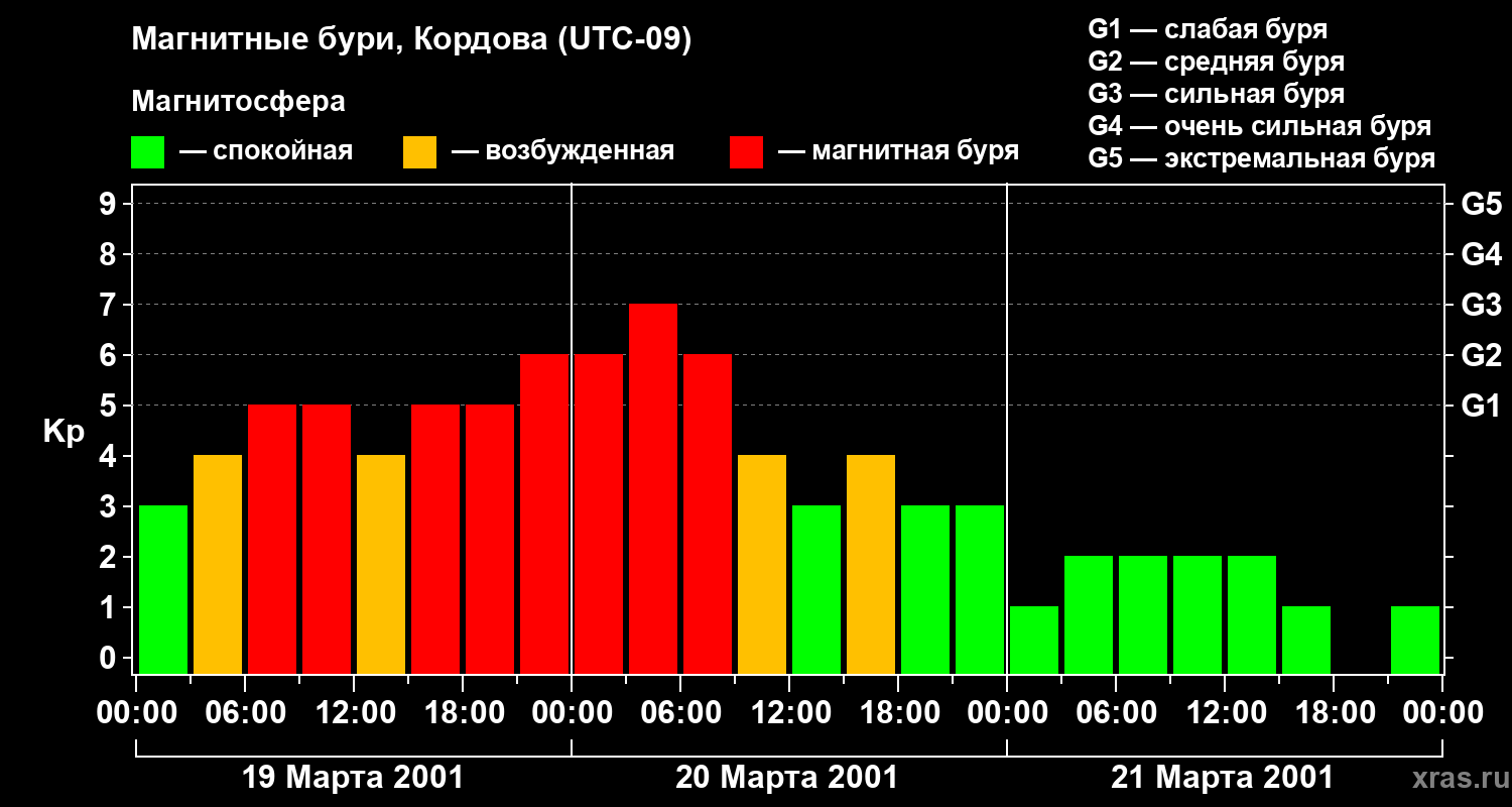 Изменения геомагнитного индекса Kp с 19 по 21 марта 2001 года для средних широт