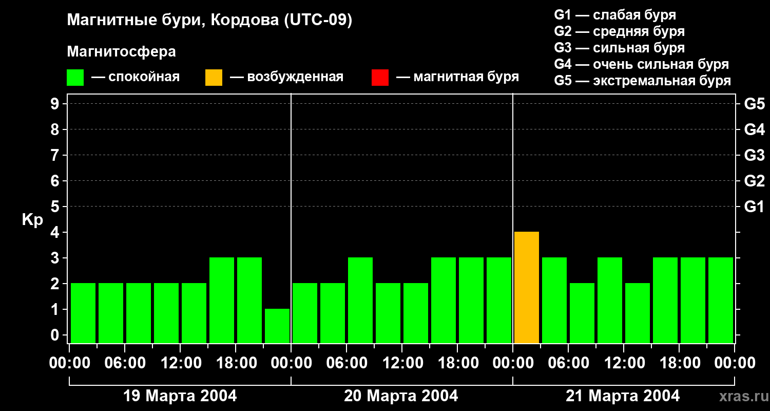Изменения геомагнитного индекса Kp с 19 по 21 марта 2004 года для средних широт