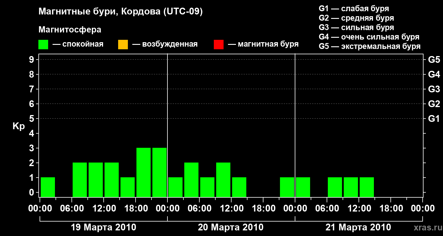 Изменения геомагнитного индекса Kp с 19 по 21 марта 2010 года для средних широт