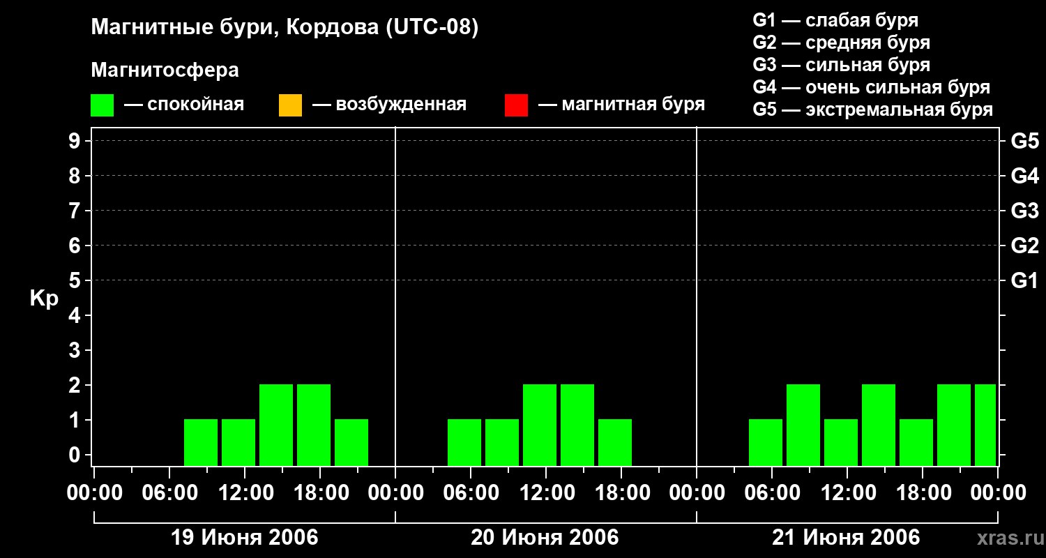 Изменения геомагнитного индекса Kp с 19 по 21 июня 2006 года для средних широт