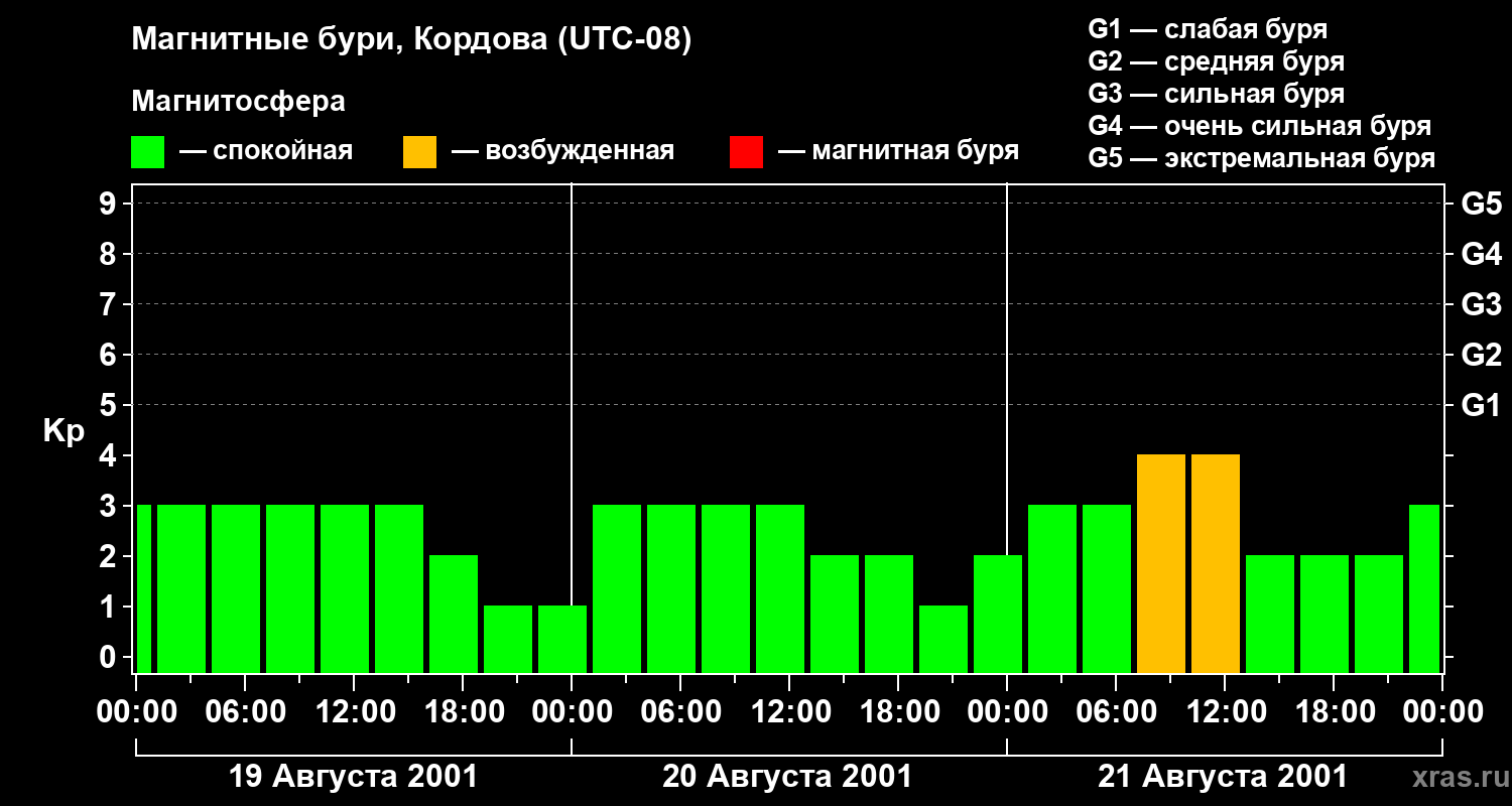 Изменения геомагнитного индекса Kp с 19 по 21 августа 2001 года для средних широт
