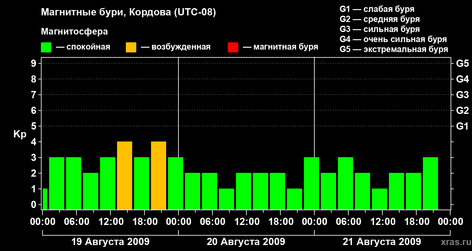 Изменения геомагнитного индекса Kp с 19 по 21 августа 2009 года для средних широт