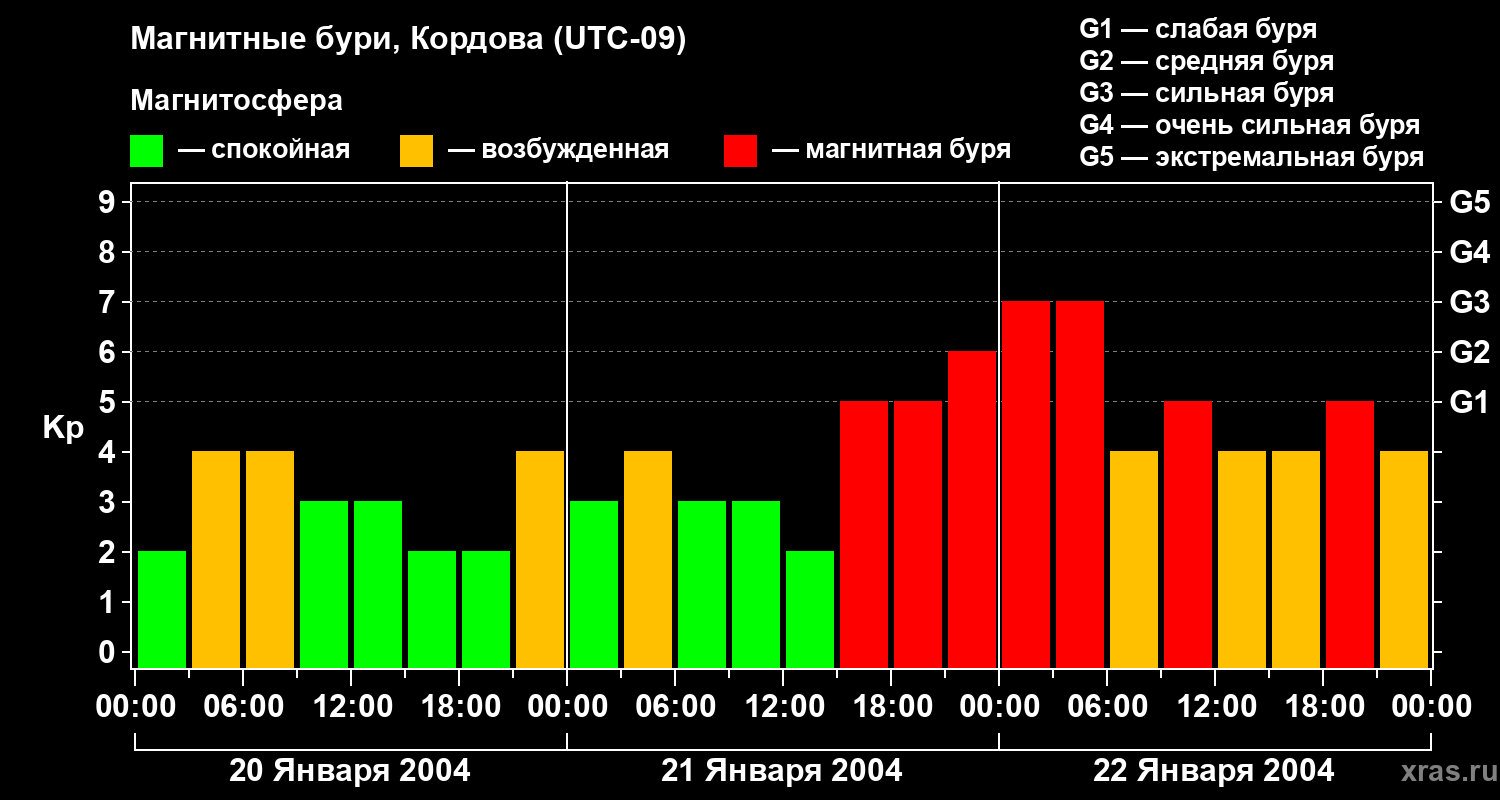 Изменения геомагнитного индекса Kp с 20 по 22 января 2004 года для средних широт