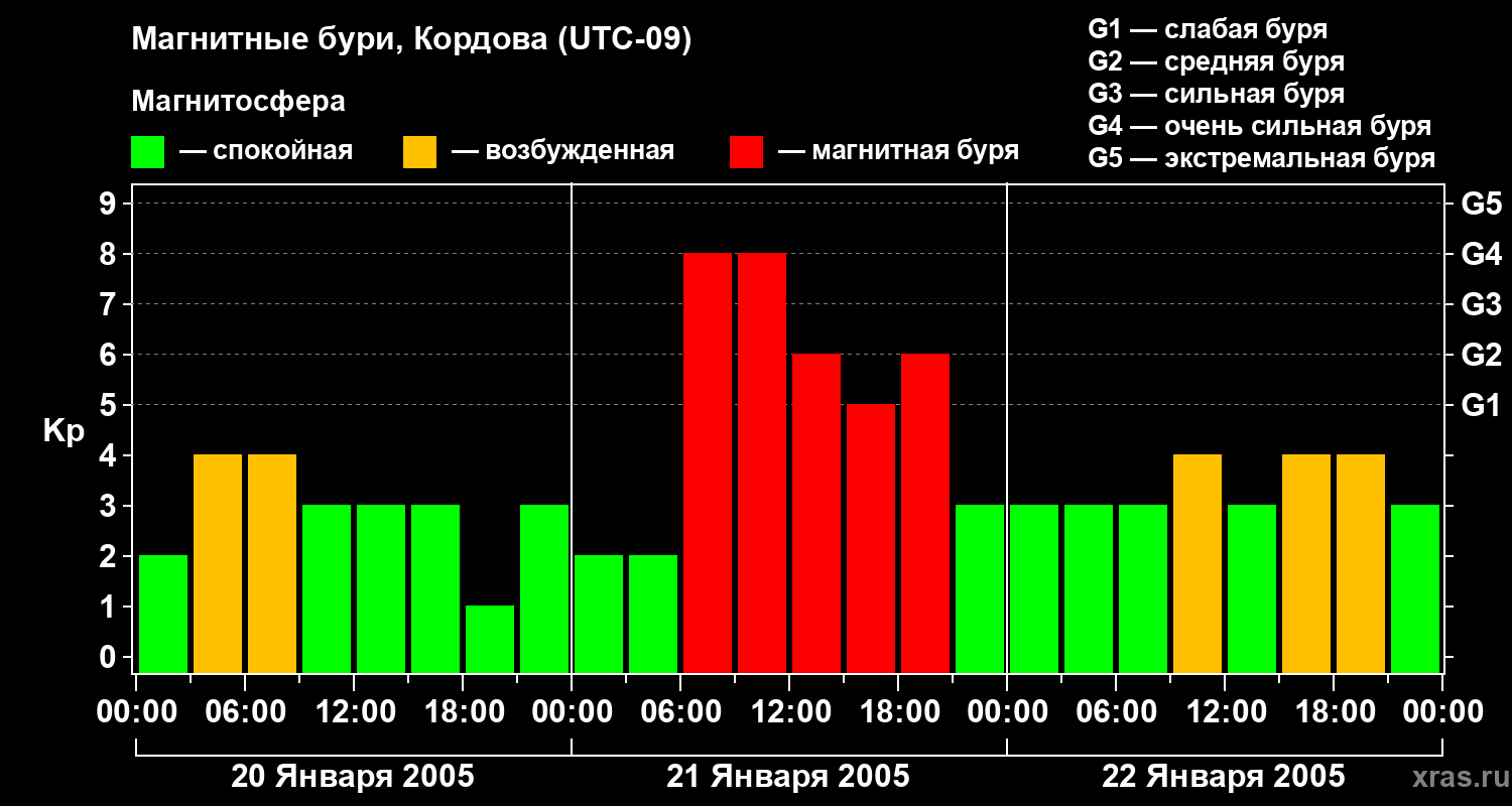 Изменения геомагнитного индекса Kp с 20 по 22 января 2005 года для средних широт