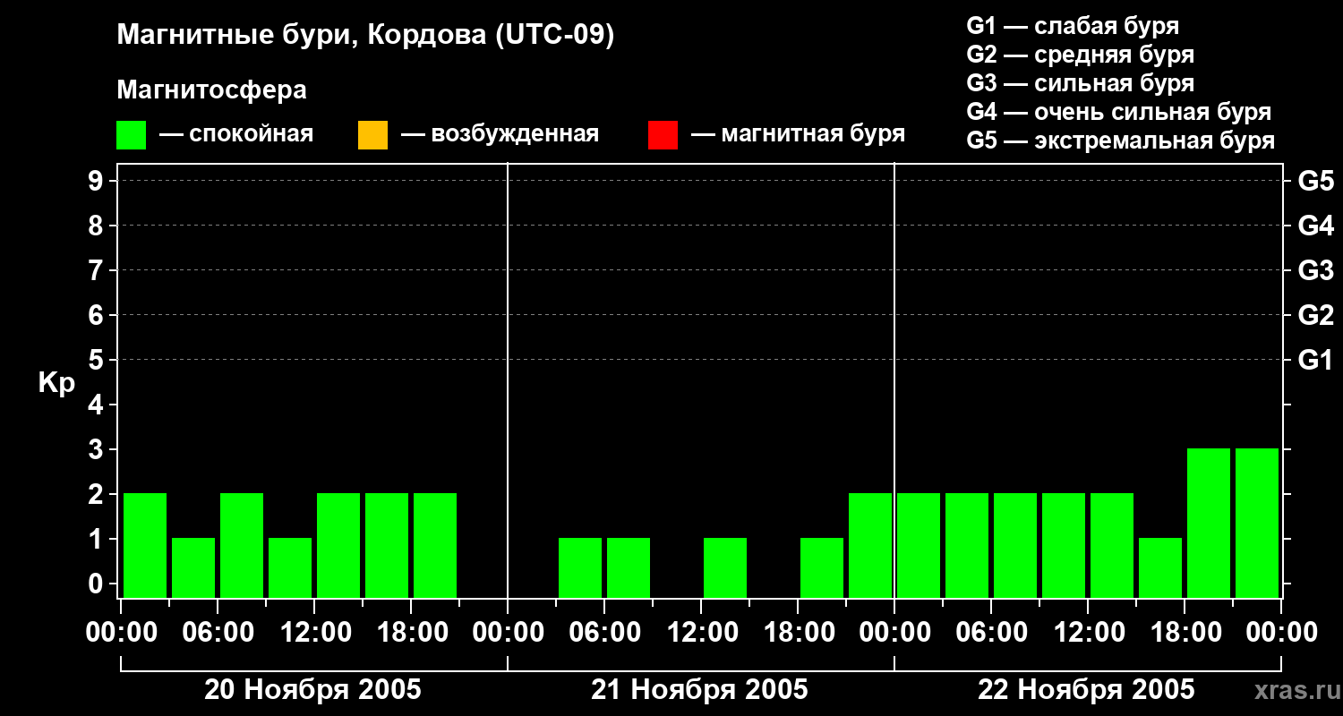 Изменения геомагнитного индекса Kp с 20 по 22 ноября 2005 года для средних широт