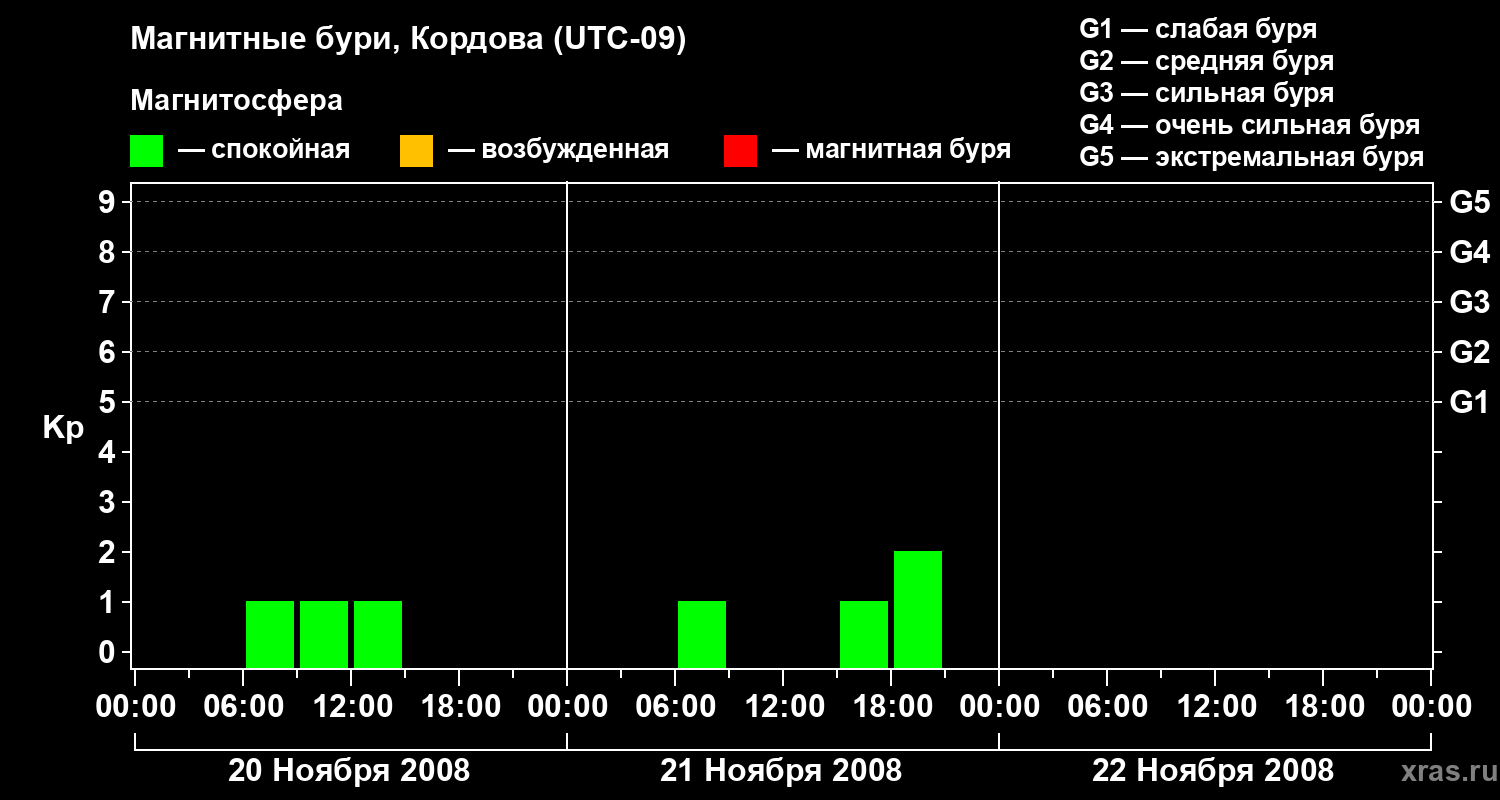 Изменения геомагнитного индекса Kp с 20 по 22 ноября 2008 года для средних широт