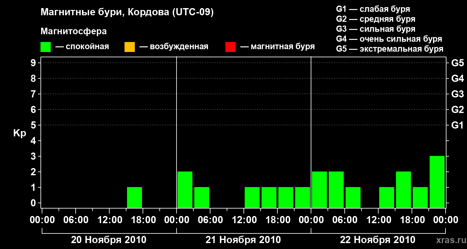 Изменения геомагнитного индекса Kp с 20 по 22 ноября 2010 года для средних широт