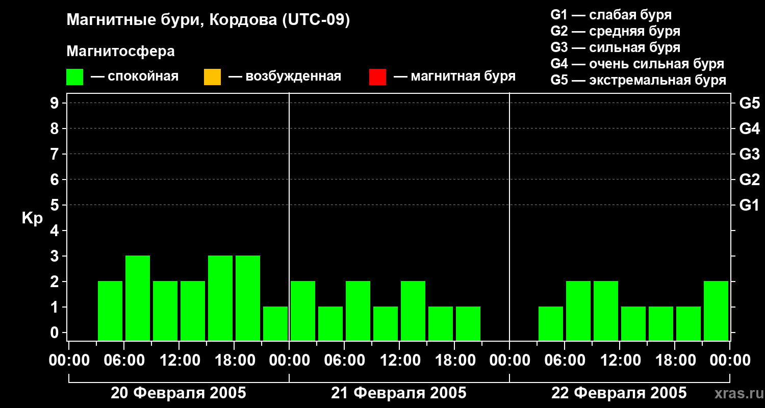Изменения геомагнитного индекса Kp с 20 по 22 февраля 2005 года для средних широт