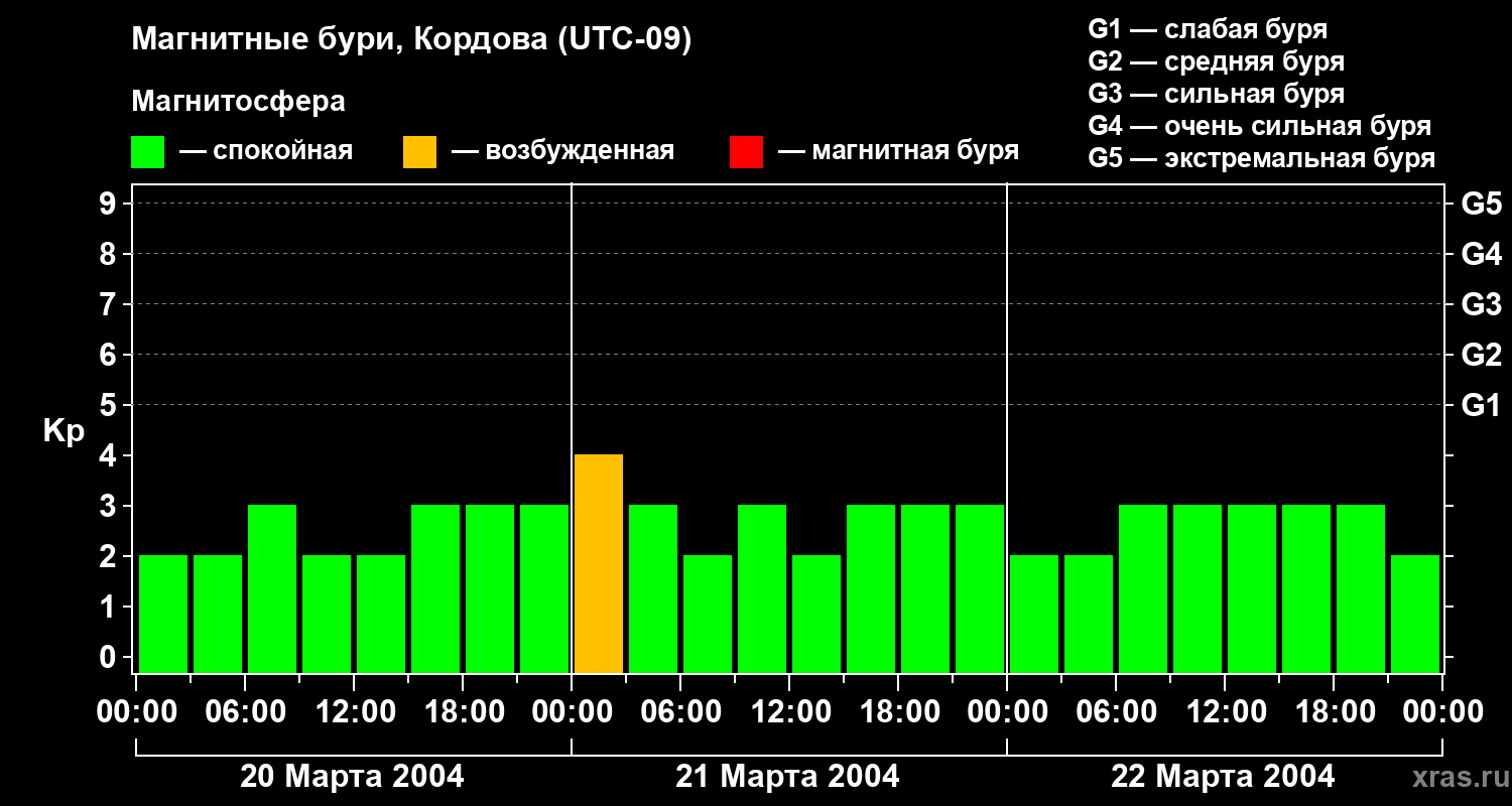 Изменения геомагнитного индекса Kp с 20 по 22 марта 2004 года для средних широт