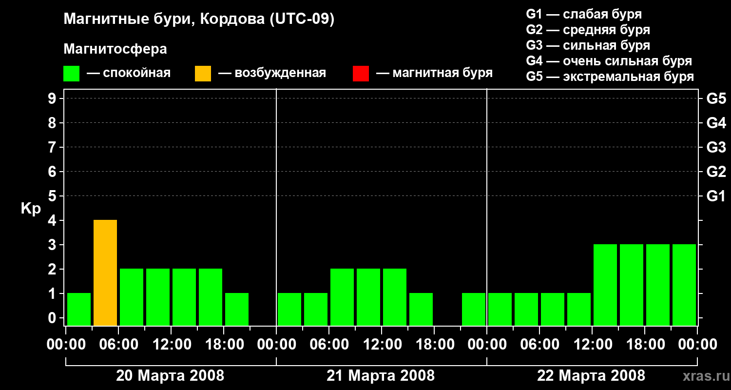 Изменения геомагнитного индекса Kp с 20 по 22 марта 2008 года для средних широт