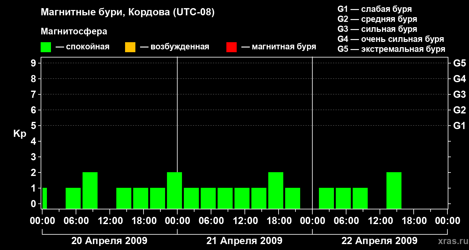 Изменения геомагнитного индекса Kp с 20 по 22 апреля 2009 года для средних широт