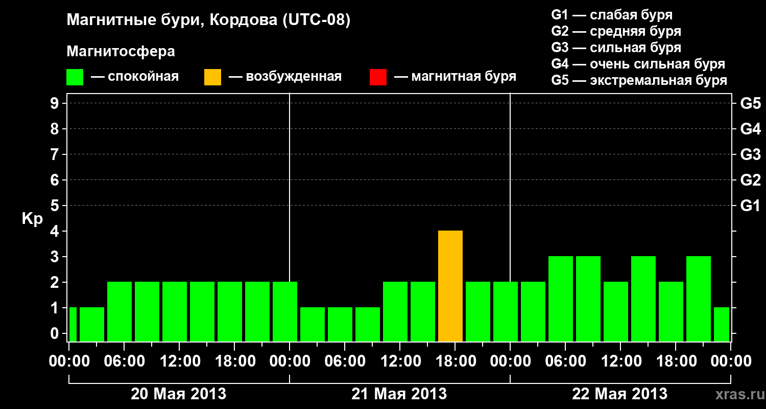 Изменения геомагнитного индекса Kp с 20 по 22 мая 2013 года для средних широт