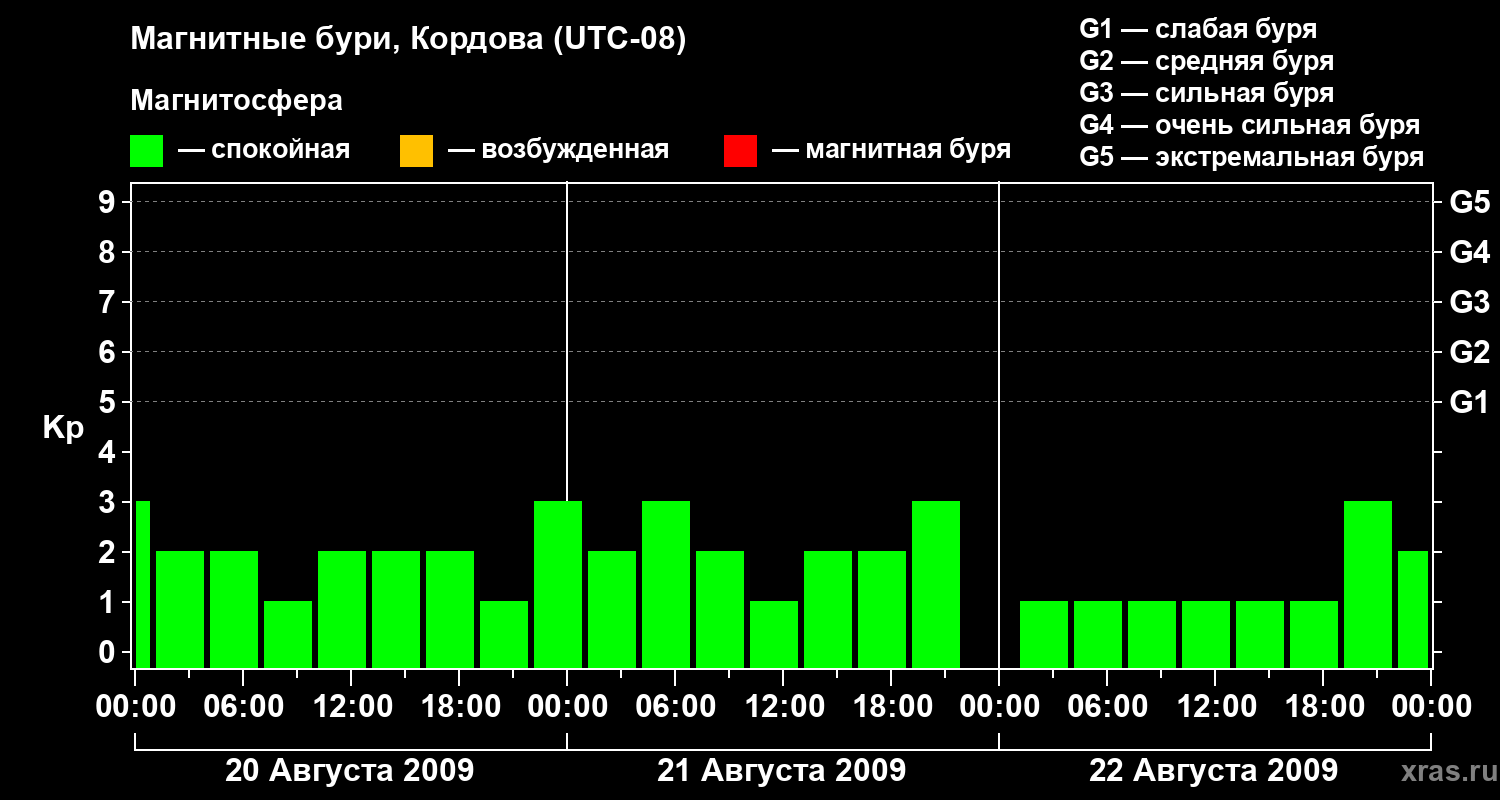 Изменения геомагнитного индекса Kp с 20 по 22 августа 2009 года для средних широт