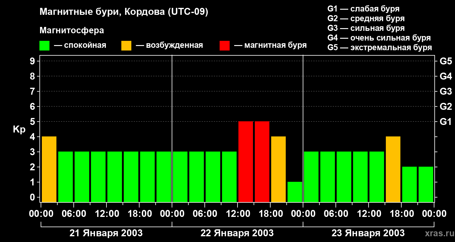 Изменения геомагнитного индекса Kp с 21 по 23 января 2003 года для средних широт