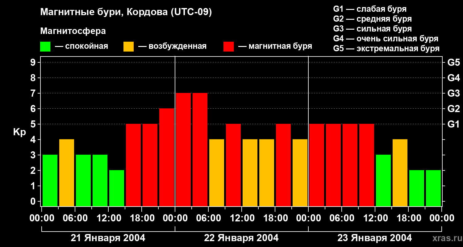 Изменения геомагнитного индекса Kp с 21 по 23 января 2004 года для средних широт