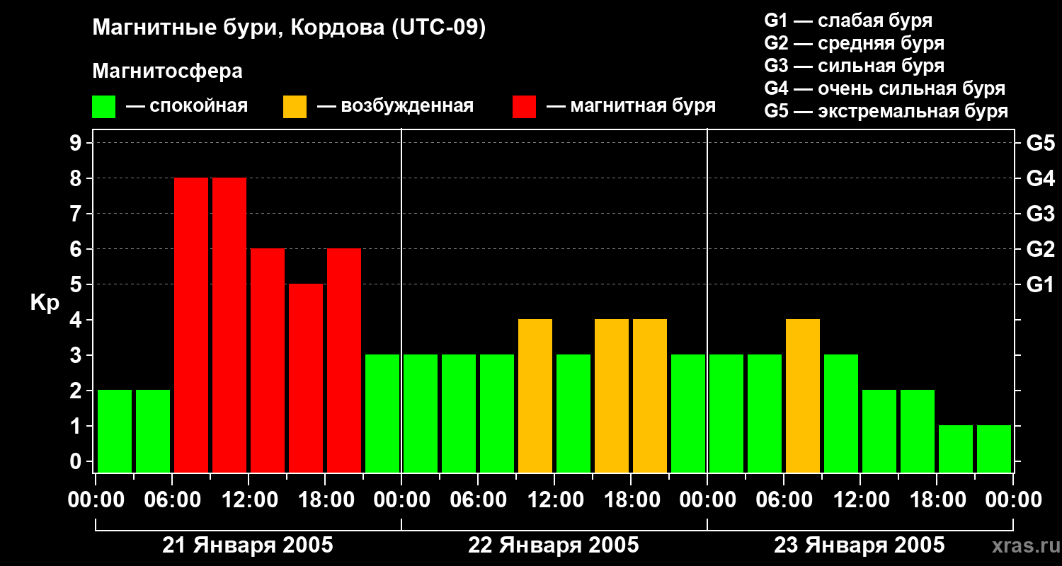 Изменения геомагнитного индекса Kp с 21 по 23 января 2005 года для средних широт