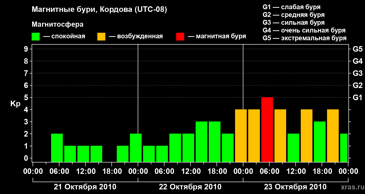 Изменения геомагнитного индекса Kp с 21 по 23 октября 2010 года для средних широт