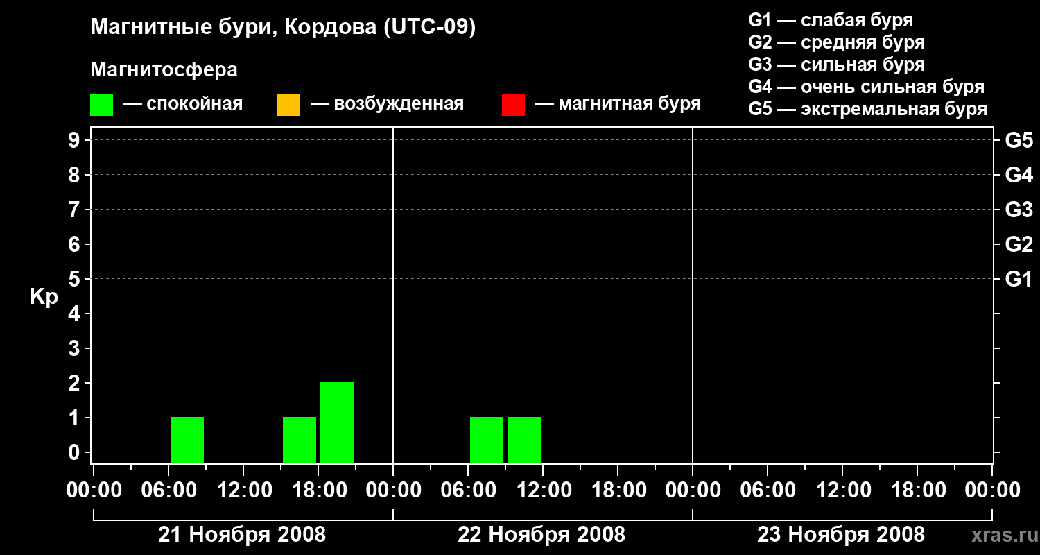 Изменения геомагнитного индекса Kp с 21 по 23 ноября 2008 года для средних широт