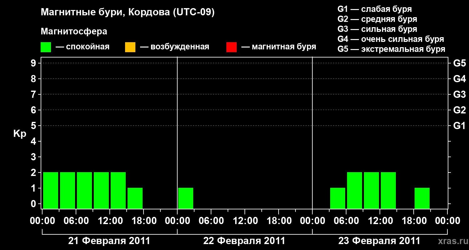 Изменения геомагнитного индекса Kp с 21 по 23 февраля 2011 года для средних широт