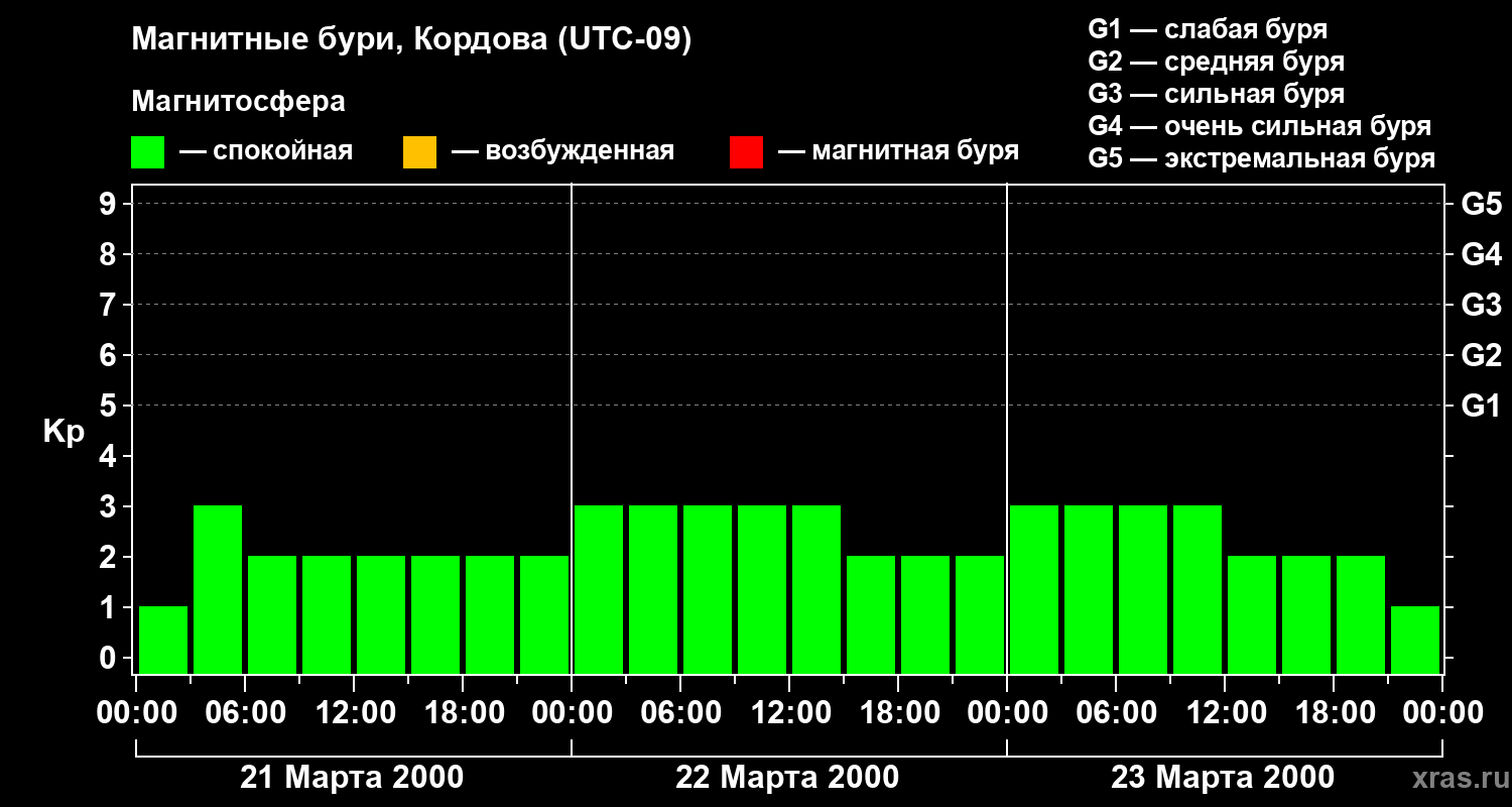 Изменения геомагнитного индекса Kp с 21 по 23 марта 2000 года для средних широт