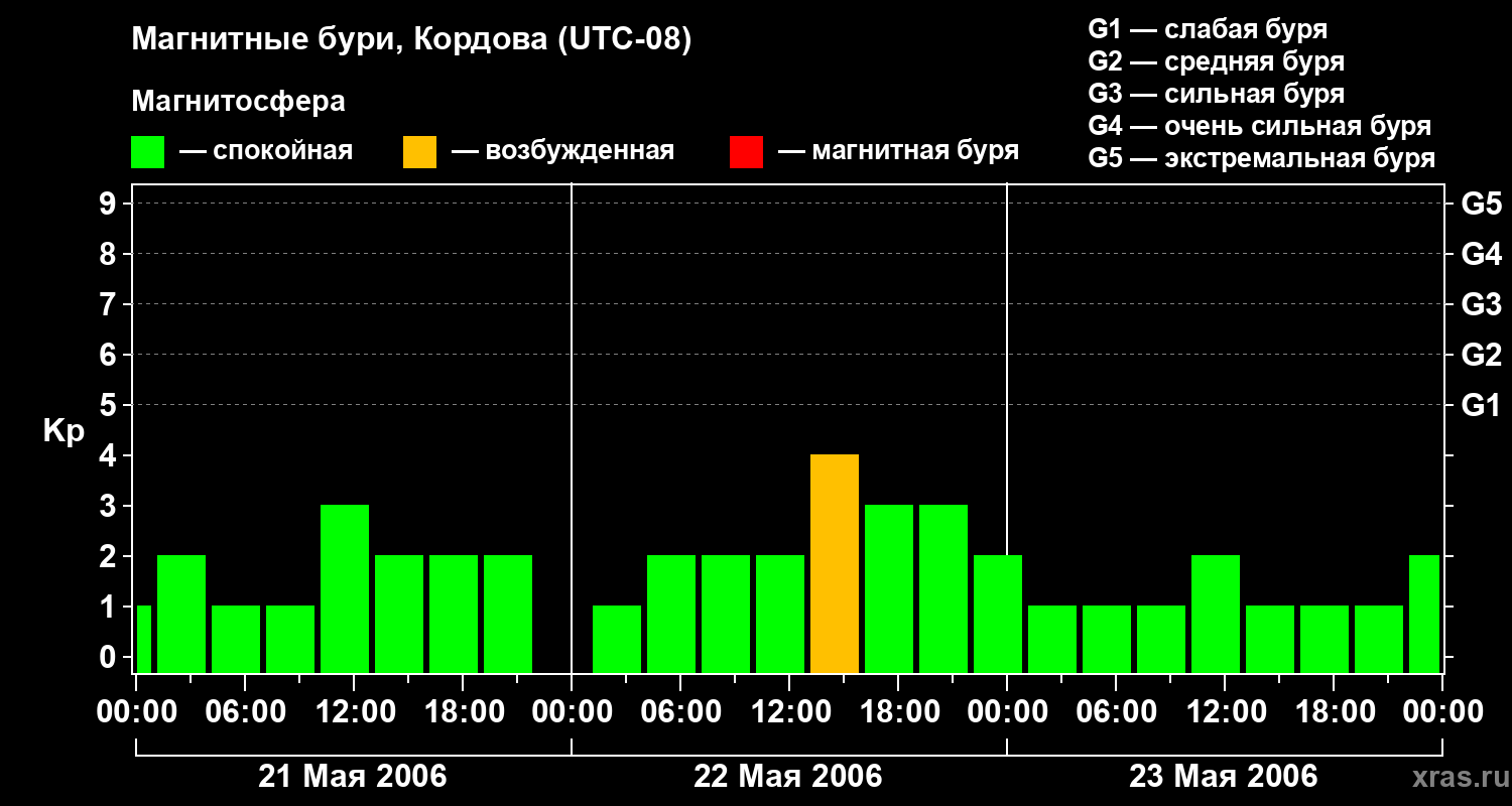 Изменения геомагнитного индекса Kp с 21 по 23 мая 2006 года для средних широт